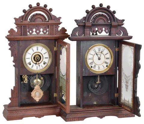 Clocks- 2 (Two): (1) Seth Thomas Clock Co., Thomaston, Conn., "Eclipse", 8 days, time and strike spring brass movement shelf clock. (2) Seth Thomas Clock Co., Thomaston, Conn., "Eclipse", 8 days, time, strike and alarm spring brass movement shelf clock. (1) Walnut case in original finish with minor damage just below the top ball on the crest. Painted dial looks to have original paint, but there is no wear or loss at the winding arbors. Minute hand maybe a replacement as appears to be too short. Original tablet. A label on the back of the door reads: "No. 0, 585". Clock lacks a pendulum. (2) Refinished walnut case that is of a different design than the other Eclipse in this set. The dial may have originally been painted but now has a paper dial. The center area looks to have been repainted. Original hands, pendulum and tablet.