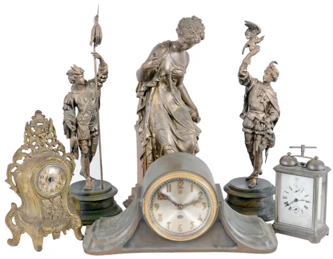 Clocks- 3 (Three) and Cast Figurines- 3 (Three) ; (1) Sangamo Electric Co., Springfield, IL, Style 5051electrically wound clock in heavy cast metal tambour case, serial no. 491 Type B, c1927; cast metal novelty 30 hour time and alarm; (2) William L. Gilbert Clock Co, 30 hour "Hello Alarm" and Gilbert "Gilt No. 115" time and alarm, both c1913; (3) Ansonia "Fisher" and "Falconer" spelter figural statues; French "Brunfaut" (?) cast spelter large seated figural, c1885. (1) The Sangamo is dusty but complete, but has an old cord and was not tested. Its dial is spotted and one hand shows some corrosion. (2) Both metal alarm clocks are dusty and worn. (3) the two Ansonia figures were recently and poorly painted, and the Falconer has a repaired wrist. The seated woman has an old patina with some wear, and one pinky finger is missing. Ht of seated lady is 20 in. Sold as is with no further information available