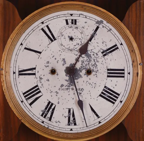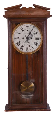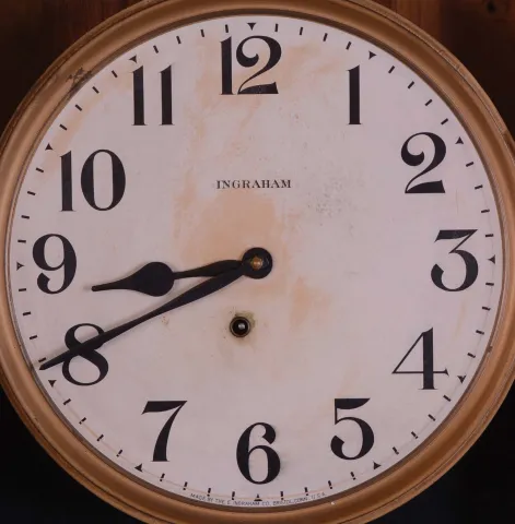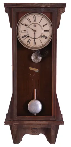 (1) Oak case in distressed original finish has scratches, dings and worn areas. One of the corner blocks on the door is missing. Original painted dial has scattered paint loss. Original hands and pendulum. Bottom bracket and top center piece are missing. Ht 45" (2) Walnut case in as found condition with the top missing and other case parts damaged or missing. Original paper dial is soiled. Original hands. Pendulum rod is broken. Ht 42" (if top was present) (3) Oak case in original finish has some small dings and scratches. Original paper dial has scattered surface abrasion. Original hands. Advertising glass is a modern replacement. Pendulum may be replaced as Ingraham generally used an embossed pendulum Clean label on the back of the case. Ht 36"