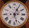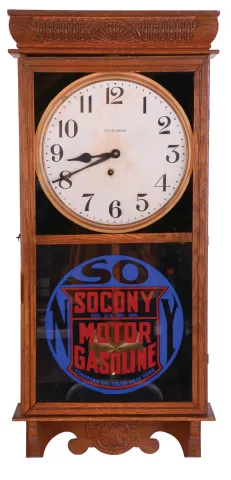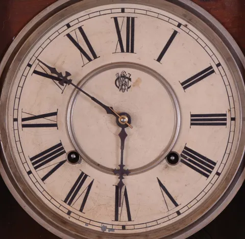 Clocks- 3 (Three): (1) New Haven Clock Co., New Haven, Conn., "Vamoose", 30 day, double wind spring brass movement wall timepiece. c1911 (2) Waterbury Clock Co., Waterbury, Conn., "Carlton", 8 day, time and strike spring brass movement wall timepiece,