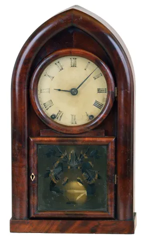 Brewster & Ingrahams, Bristol, Conn., 8 day "Round Gothic" or "beehive" clock with repeating movement and nice cut glass tablet. Early movement with cast iron back plate and spring barrels and "Harp" gong base. Heavy iron dial is dirty, but has original base paint with faded numerals and minor chips. Mahogany case has good veneer and original finish with some minor loss and dings. Original pendulum bob.