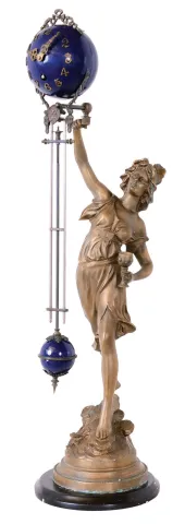 Swinging Arm Figural Clock, Modern Asian Reproduction of Moreau original French statue, 8 day time only movement this quality reproduction is in near-new condition, with a bit of scuffing on the painted metal base. The pendulum is anchored to the movement back plate, so we did not test it.