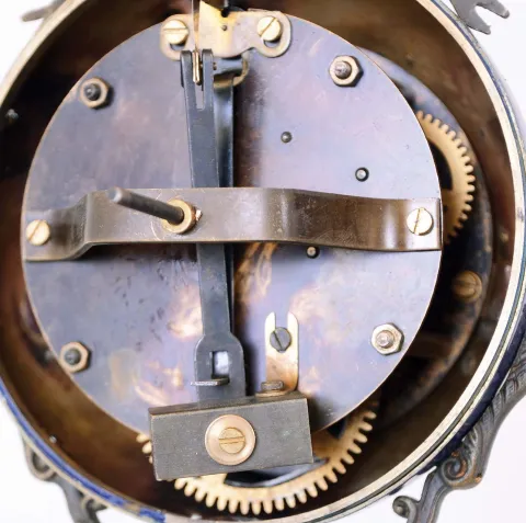 this quality reproduction is in near-new condition, with a bit of scuffing on the painted metal base. The pendulum is anchored to the movement back plate, so we did not test it.