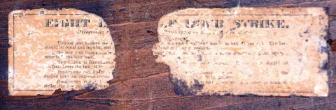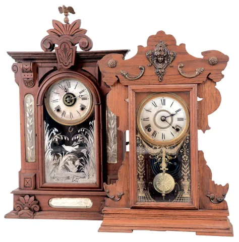 (1) Walnut case in an old finish. The top decorations on either side of the center ornament are missing and the center ornament is lacking the center tip and a banjo eagle has been put in its place. Dial pan maybe replaced as there are extra holes in the case that don't match. Original tablet and mirrors. (2) Oak case in an old finish. Original paper dial has stains with abrasion at the winding arbors. Original hands, pendulum and tablet. Ht 23"