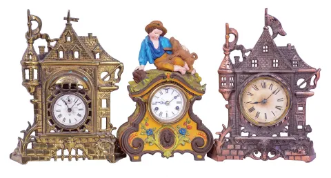 Clocks- 5 (Five): (1) Waterbury Clock Co., Waterbury, Conn novelty alarm clock with a 1 days spring driven time and alarm movement in a cast metal case. c1890. (2) E. N. Welch, Forestville, Conn., unidentified novelty alarm clock with a 1 days spring