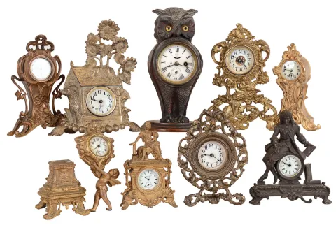 Clocks- 9 (Nine) Novelty cast metal American 30 hour time only; makers include Westclox, Ansonia, Seth Thomas, Waterbury, and one with a replacement Elgin pocket watch movement, late 19th and early 20th centuries
