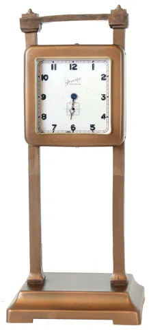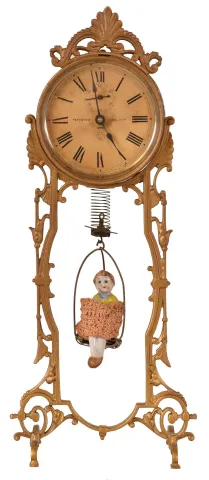 Clocks- 13 (Thirteen) desk and table clocks including (1) Ansonia Clock Co., New York, NY, "Gravity Clock" 36-hour time only novelty clock c1924; (2) Ansonia Clock Co., New York, NY "Jumper No. 2", 30 hour, bobbing or bouncing doll novelty timepiece, c1886; (3) an automatic car clock and ten miscellaneous mostly modern (1) the metal case appears to have some new paint, with some scratches The signed silvered dial has some scratches, too; the minute hand is detached and the seconds hand is absent. There is no ticking, and the hand setting knob is absent, so service will be needed, and the standing racks appear a bit bent. (Caution: The racks are spelter and easily broken.) (2) the doll is a replacement. Ht 14.5in