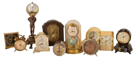 Clocks- 13 (Thirteen) desk and table clocks including (1) Ansonia Clock Co., New York, NY, "Gravity Clock" 36-hour time only novelty clock c1924; (2) Ansonia Clock Co., New York, NY "Jumper No. 2", 30 hour, bobbing or bouncing doll novelty timepiece,
