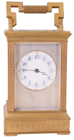 France, carriage clock, Anglaise case with engraved, fleur de lis inspired ornament, and set with beveled glasses, Arabic numeral white enamel dial with silvered mask, blued steel Breguet style hands, 8 day time and strike movement with lever platform,