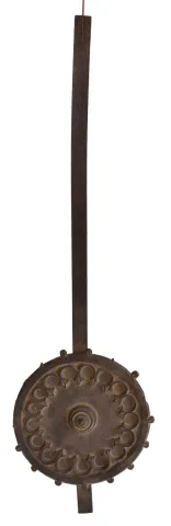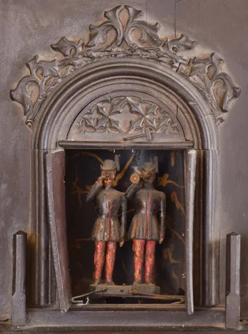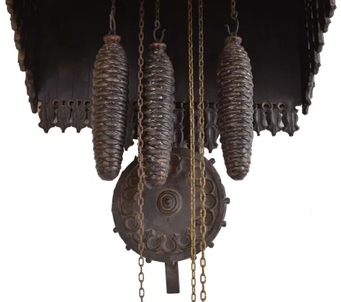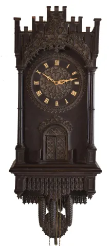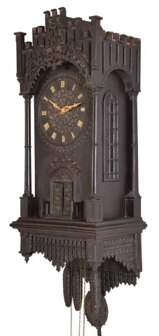 Trompeteruhren, or Trumpeter Clock, attributed to Emilian Wehrle, Germany, the ebonized, architectural case of Gothic design, with crenellated parapet, the front of which is adorned with applied rustic vine carving, the dial, doors, and base with various pierced, foil carvings, and with columns at the corners, case sides with pierced, arched access doors, Roman numeral wooden dial with blind, geometric, foil fret, pierced bone hands, three train, weight driven movement with wooden plates and brass wheels, and carved wooden pendulum, also with blind fret carving, music played on 6 pipes, the trumpeters emerging from behind the doors at the hour to play a tune case with losses, splits, and repairs, tracery at top of right side missing, left side with partial loss, some merlon moldings missing, some replaced, tops of turrets missing, dial with split, hands may be replaced, minute with repair, case back with reinforcement of fretwork at bottom, movement dirty, complete and functional, musical portion needs work, makes a bit of sound, but the bellows are leaking, and also missing two tin pipes, trumpeters dirty, one missing his horn, weights missing (weights shown were for purposes of photograph, not included with clock). Please see Justin Miller "Rare and Unusual Black Forest Clocks", page 150, fig. 4.58, for a nearly identical shelf model.
