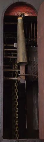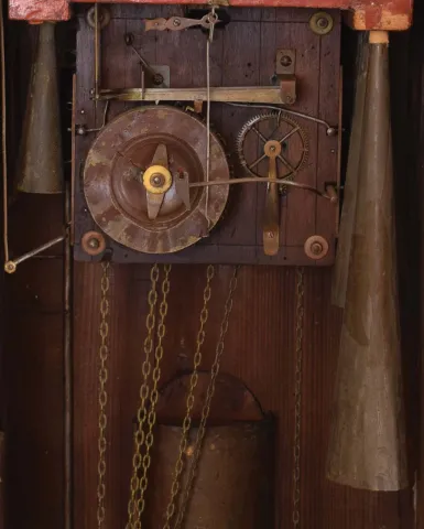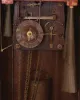 case with losses, splits, and repairs, tracery at top of right side missing, left side with partial loss, some merlon moldings missing, some replaced, tops of turrets missing, dial with split, hands may be replaced, minute with repair, case back with reinforcement of fretwork at bottom, movement dirty, complete and functional, musical portion needs work, makes a bit of sound, but the bellows are leaking, and also missing two tin pipes, trumpeters dirty, one missing his horn, weights missing (weights shown were for purposes of photograph, not included with clock). Please see Justin Miller "Rare and Unusual Black Forest Clocks", page 150, fig. 4.58, for a nearly identical shelf model.