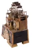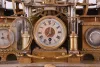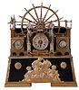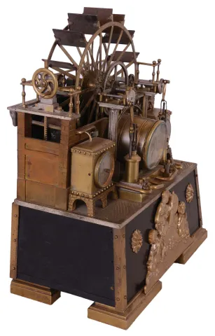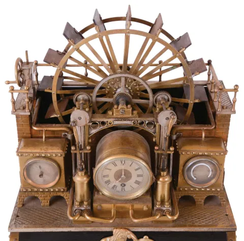 France, industrial series "Paddle Wheel" with alterations. Cast bronze, the mill wheel supported by two Ionic columns, and in a faux masonry mill race, driving two pistons flanking the 8 day timepiece, and with thermometer and barometer set in rectangular