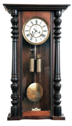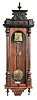 Clocks- 2 (Two) German Gustav Becker walnut 8 day 2 weight Vienna regulator wall clocks, #1365171 and #2262724; late 19th and early 20th centuries the case with the crest has been partially lightened but areas of the old dark finish remain, especially on the top. Its crest is missing two finials, and also the bottom finial is absent. It has a signed movement but no dial, hands or weights. The other case retains its old finish, and has no crest, bottom bracket, or two lower finials. Its trademarked multicolor dial is good but there is no seconds hand. Hts 46.5 in and 32.5 in