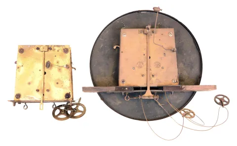 the case with the crest has been partially lightened but areas of the old dark finish remain, especially on the top. Its crest is missing two finials, and also the bottom finial is absent. It has a signed movement but no dial, hands or weights. The other case retains its old finish, and has no crest, bottom bracket, or two lower finials. Its trademarked multicolor dial is good but there is no seconds hand. Hts 46.5 in and 32.5 in