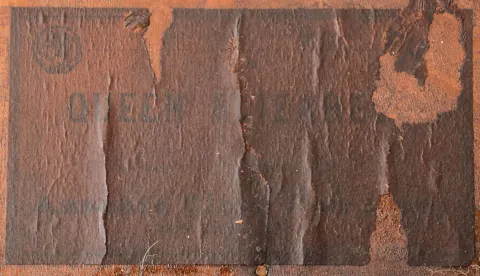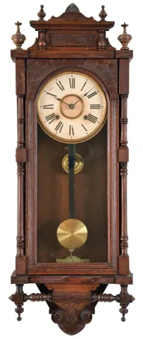 Clocks- 2 (Two): (1) New Haven Clock Co., New Haven, Conn., "Eclipse" wall hanging clock with a spring driven 8 day time and simple calendar movement in a solid oak case and made for the American Wringer Co., 99 Chambers St., NY. c1910. (2) Ansonia Clock Co., New York, NY, "Queen Elizabeth" wall hanging clock with a spring driven 8 day time & half-hour strike movement in an oak case. c1880. (1) The oak case retains some original finish. The paper dial may be a later replacement. The hour and minute hands are original. The calendar hand may be a later replacement. The movement is signed. Ht. 33.5in. (2) The oak case retains its original, and alligatored, finish. The original paper dial is in good condition. The hands are original. The movement is signed. Ht. 37.5in.