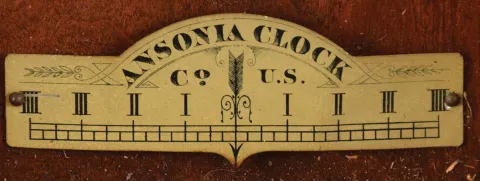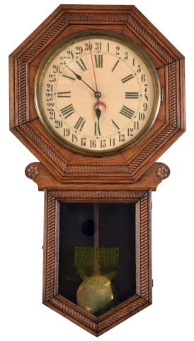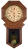 Clocks- 2 (Two): (1) New Haven Clock Co., New Haven, Conn., "Eclipse" wall hanging clock with a spring driven 8 day time and simple calendar movement in a solid oak case and made for the American Wringer Co., 99 Chambers St., NY. c1910. (2) Ansonia Clock