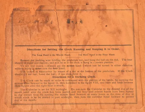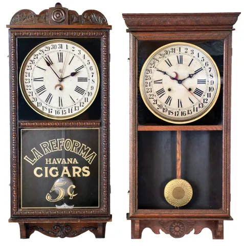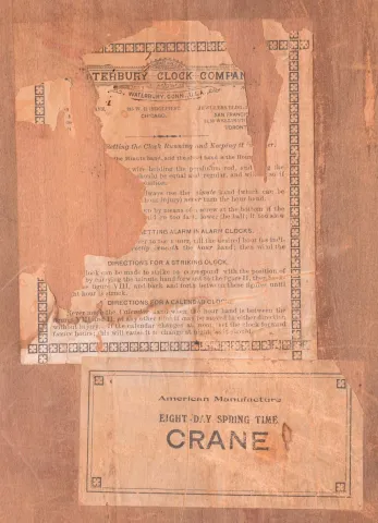 Clocks- 2 (Two): (1) Waterbury Clock Co., Waterbury, Conn., "Crane" wall hanging clock with a spring driven 8 day time and simple calendar movement in a solid oak case., c.1912. (2) Sessions Clock Co., Forestville. Conn., "Regulator H" wall hanging clock with a spring driven 8 day time, strike and simple calendar movement, c1908. (1) The case has some original finish, but it is rough in some areas. The original painted dial is in very good condition. The hands are original. Both door glasses are replacements. The movement is signed. Ht. 37in. (2) The case has its original finish, but somewhat alligatored. The original paper dial is in excellent condition, The hands are original. The bottom door glass is missing. The top door glass appears to be original. The movement is signed. Ht. 35.5in.
