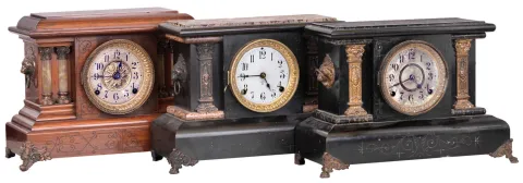 Clocks- 3 (Three): (1) Seth Thomas Clock Co., Thomaston, Conn., 8 day, time and strike spring brass movement adamantine mantel clock. (2) Seth Thomas Clock Co., 8 day, time and strike spring brass movement adamantine mantel clock. (3) Seth Thomas Clock Co., 8 day, time and strike spring brass movement adamantine mantel clock. (1) Adamantine case in as found condition has a little damage on the bottom edge and along the top back edge. Original paper dial is badly soiled with losses. Original hands. Ht 11" (2) Adamantine case in nice condition. Original porcelain dial is fine with original hands. Ht 11" (3) Mahogany color adamantine case in fine condition has just a slight roughness in one place on the bottom front edge and a small chip on the top back edge. Original paper dial is stained and has age darkened. Original hands. Ht 11.75"