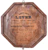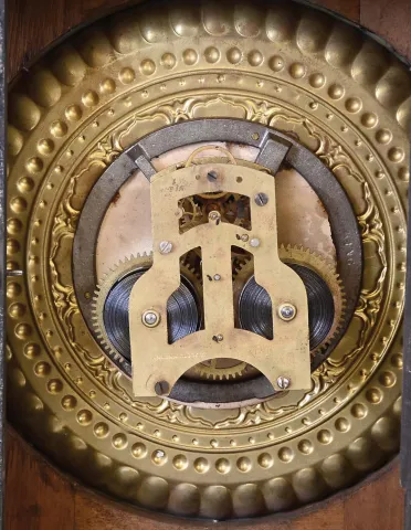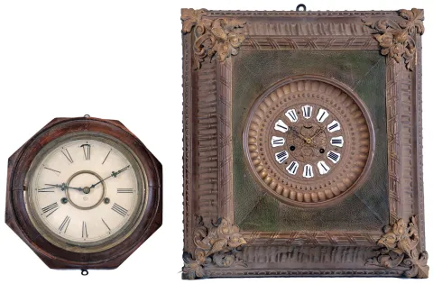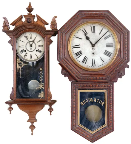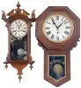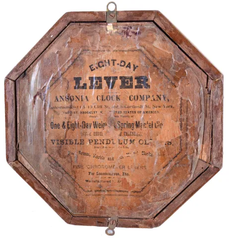 Clocks- 4 (Four) Wall: Ansonia "Richelieu" brass 8 day time and strike balance movement picture frame clock, c1900; Waterbury "Montreal" walnut 8 day time and strike, c1883; New Haven "Bank" 8 day drop octagon oak timepiece, c1911; Ansonia octagon "Lever" 30 hour time and strike, walnut with 8" dial, c1900. all appear complete with old finishes, although the Waterbury may have been refinished some time ago. Its painted metal dial also may be newer, its glass may have lost some of its design. The New Haven has damage to one side 'ear'. The octagon "Lever" has a large rear label, its glass is detached, and its dial also is newer. The metal and plush Ansonia has an old dusty patina. The movements were not tested, and the "Richelieu" hairspring is detached. Sold as is with no further details available. Richelieu is 19.5 in x 17 in; others Hts are 11 in, 33 in and 35.5 in