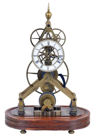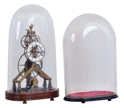 Skeleton clock and a dome- (1) Chinese reproduction 8 day, spring brass fusee movement great wheel skeleton timepiece with porcelain dial. (2) Reproduction glass dome and base suitable for a skeleton clock. (1) There is an old-looking patina on the brass, the wood base and dome are fine, the clock ticks but was not tested long term. (2) Glass dome and an old base. Dome measures 18.75" x 12" x 7"