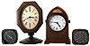 both of the black aircraft clocks tick and set, but the dials and hands are worn and faded. One phenolic case has damage to the dial ring; the other has "Don Jordan" scratched boldly on the top. The Waltham desk clock has a solid wood case in nice condition, but the winding position will not engage. The Seth Thomas ticks and stops. Its height is 9 in