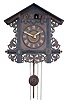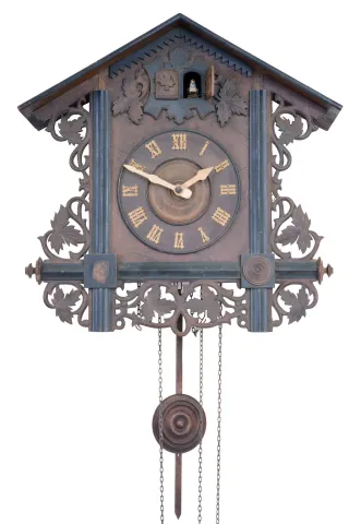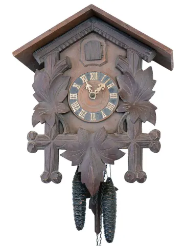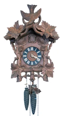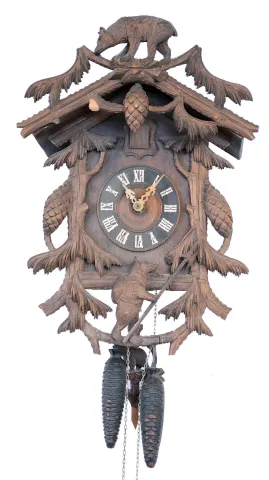 Clocks- 5 (Five) German Black Forest: three 30 hour cuckoos; one cuckoo and quail; modern time and strike in fretwork case the largest and best is the two-bird, but it is missing its crest, weights, and some smaller case components. The hands are incorrect, but the painted birds are good. One of the three one-bird cuckoos has a complete John Wannamaker rear paper label; another has a bear motif with three carved bears showing, with some poor glue jobs and a piece of carving missing. Each has complete movements, bellows and weights. The fretwork clock is late 20th century, but attractive. None were tested, and there are minor losses and damage, and all are sold as is with no further details available. Two-bird case Ht is 18 in; bear clock Ht is 19 in