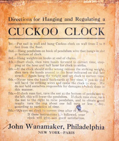 the largest and best is the two-bird, but it is missing its crest, weights, and some smaller case components. The hands are incorrect, but the painted birds are good. One of the three one-bird cuckoos has a complete John Wannamaker rear paper label; another has a bear motif with three carved bears showing, with some poor glue jobs and a piece of carving missing. Each has complete movements, bellows and weights. The fretwork clock is late 20th century, but attractive. None were tested, and there are minor losses and damage, and all are sold as is with no further details available. Two-bird case Ht is 18 in; bear clock Ht is 19 in