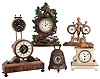 Clocks- 6 (Six) French Novelty 8 day and 30 hour time only mantel clocks. Includes gravity clock, Farcot (?) with visible front of movement, figural with alarm and barometer, onyx with top lion, bell form, and painted iron forest hunting theme.