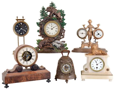 Clocks- 6 (Six) French Novelty 8 day and 30 hour time only mantel clocks. Includes gravity clock, Farcot (?) with visible front of movement, figural with alarm and barometer, onyx with top lion, bell form, and painted iron forest hunting theme. these all appear complete and original. The black dial of the gravity clock is peeling; two are missing back panels, and there is no front bezel and glass on one of the figural's clock. None tested, sold as is with no further details available. Tallest Ht is 14 in
