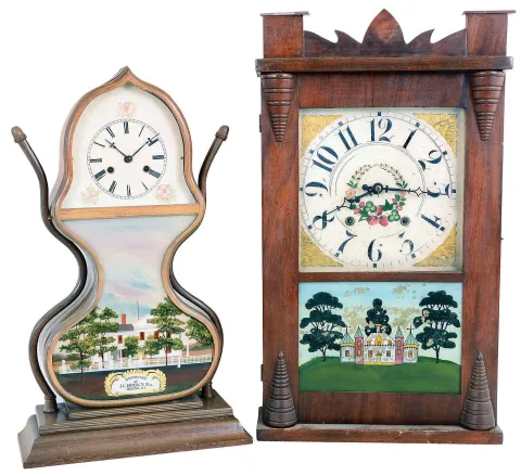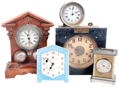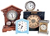 Clocks- 12 (Twelve): (1) Wooden works shelf clock with an unidentified Connecticut 30 hours time & strike movement in an unusual mahogany veneered case. c1830; (2) Electric Light timer by Reliance Automatic Lighting Co., Racine, Wisconsin. (3) Oversized shelf model alarm clock of American origin; c1910. (4) Small electric clock of unknown manufacture; (5) Alarm clock mounted on wooden stand; manufacturer not identified; c1910; (6) Slave clock of unidentified origin.; (7) Waterbury Clock Co., Waterbury, Conn., "Tourist" carriage clock with a spring driven 30 hours time and alarm movement in a nickel plated case; c1891; (8) Small wall hanging timepiece with a blue and white porcelain dial likely of German or Dutch origin; (9) Western Clock Co., LaSalle, Illinois, "Westclox Alarm" with a 30 hours time and alarm movement; c1920; (10) Slave clock of unidentified origin (11) Modern day handmade copy of a J. C. Brown Acorn clock; (12) Standard Electric Time Co., Springfield, Mass. slave clock; (1) The curious case retains some original finish. The dial is nice and the hands original. Ht. 27.5"; (2) This is a 20 amp, 250 volt unit; Ht. 9.75"; (3) The movement is unsigned, Ht. 13"; (4) The dial is labelled "Magenta"; Ht. 7.25"; (5) The oak stand, mounted bells, clock bezel, dial, beveled glass and hands are all in nice condition; Ht. 12"; (6) The nickel plated case has a 3.5 inch dial; Ht. 5"; (7) The case has oxidized somewhat. The dial and hands are good; Ht. 6" (8) The porcelain dial is in good condition; Ht. 7.25"; (9) The case has some oxidation but the dial and hands are in excellent condition. Ht. 5.5"; (10) The nickel plated case has a 3.5 inch dial; Ht. 5"; (11) The clock has an imported movement (12) The case, dial and hands are in nice condition. Ht, 10.5".
