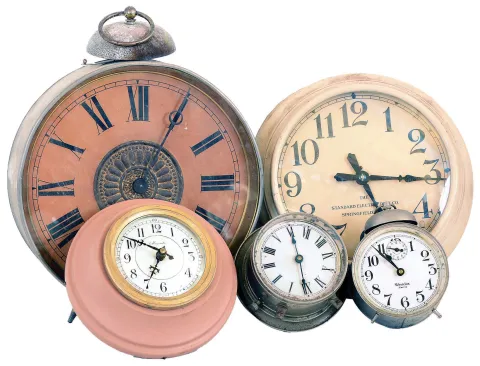 (1) The curious case retains some original finish. The dial is nice and the hands original. Ht. 27.5"; (2) This is a 20 amp, 250 volt unit; Ht. 9.75"; (3) The movement is unsigned, Ht. 13"; (4) The dial is labelled "Magenta"; Ht. 7.25"; (5) The oak stand, mounted bells, clock bezel, dial, beveled glass and hands are all in nice condition; Ht. 12"; (6) The nickel plated case has a 3.5 inch dial; Ht. 5"; (7) The case has oxidized somewhat. The dial and hands are good; Ht. 6" (8) The porcelain dial is in good condition; Ht. 7.25"; (9) The case has some oxidation but the dial and hands are in excellent condition. Ht. 5.5"; (10) The nickel plated case has a 3.5 inch dial; Ht. 5"; (11) The clock has an imported movement (12) The case, dial and hands are in nice condition. Ht, 10.5".