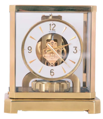 LeCoultre, Switzerland, "Atmos" perpetual gold-plated brass and glass time only mantel clock, serial number 156355