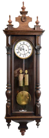 Clocks- 2 (Two) Gustav Becker German walnut 8 day 2 weight Vienna regulator wall clocks: Medaille D'Or movements #204170 and #1794878; late 19th and early 20th centuries one ornate case retains an old finish, the other is refinished. There are minor wood losses, some detached wood parts, and some shrinkage splits. One top crest is old, with some top damage, the other is newer, and one bottom wood piece is damaged. Both dials are fine; the multicolor is signed. One weight pair is mismatched. The stamped movements appear complete. Hts 51 in and 52 in