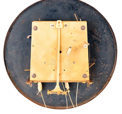 one ornate case retains an old finish, the other is refinished. There are minor wood losses, some detached wood parts, and some shrinkage splits. One top crest is old, with some top damage, the other is newer, and one bottom wood piece is damaged. Both dials are fine; the multicolor is signed. One weight pair is mismatched. The stamped movements appear complete. Hts 51 in and 52 in