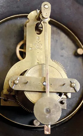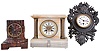 Clocks- 3 (Three) French 8 day: (1) time only cast iron cartel wall clock, Japy tic-tac movement, Latin inscription meaning "if you want peace, prepare for war"; (2) time and strike white onyx mantel with gilt columns and bezel, Japy Freres movement; (3)
