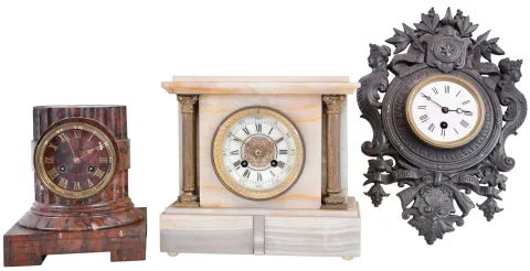 Clocks- 3 (Three) French 8 day: (1) time only cast iron cartel wall clock, Japy tic-tac movement, Latin inscription meaning "if you want peace, prepare for war"; (2) time and strike white onyx mantel with gilt columns and bezel, Japy Freres movement; (3) time and strike red marble column mantel, unsigned movement; c1890 all are in good original condition with minor marble chips. The wall clock never had a front bezel. The movement are complete, and they tick and strike, but were not tested long term. Sold as is with no further details available. Hts 14.5 in, 9 in and 8 in