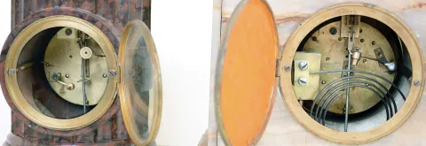all are in good original condition with minor marble chips. The wall clock never had a front bezel. The movement are complete, and they tick and strike, but were not tested long term. Sold as is with no further details available. Hts 14.5 in, 9 in and 8 in