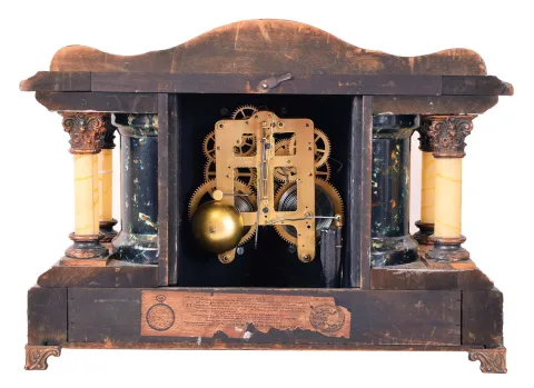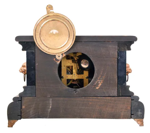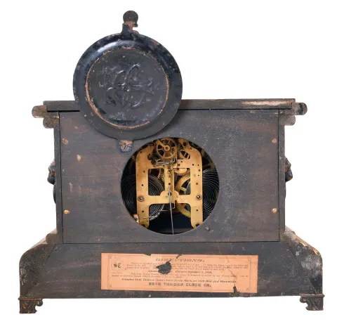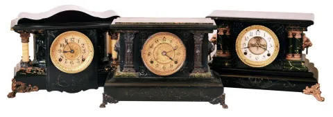 Clocks- 3 (Three): (1) William L. Gilbert Clock Co., Winsted, Conn., "Blackbird", 8 day, time and strike spring brass movement enameled wood case mantel clock with visible escapement. (2) Seth Thomas Clock Co., Thomaston, Conn., 8 day, time and strike spring brass movement "Adamantine? mantel clock. (3) Seth Thomas Clock Co., Thomaston, Conn., 8 day, time and strike spring brass movement enameled case mantel clock. (1) Enameled wood case is very clean with a couple dings on the top front edge. Paper dial has minor stains and is otherwise very clean and maybe original. Original hands. Ht 11" (2) Adamantine case is very clean with some damage at the top left corner and a small chip to the right corner. Original paper dial is stained. Original hands. This model is similar to the Shasta with a different style top. Ht 12" (3) Enameled wood case in as found condition with stains from storage in damp environment Original embossed metal dial is tarnished. Original hands.