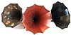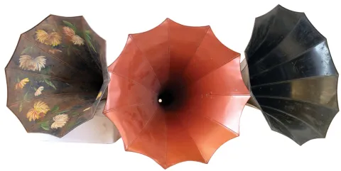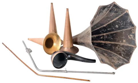 Lot of phonograph horns and parts including: two (2) morning glory horns with painted interior decoration, three (3) complete morning glory horns, black with gold ribs, (two with decals marked "Standard", one marked "Home") and one Home-size horn