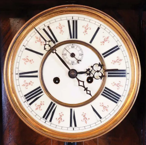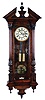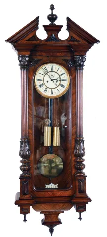 Germany, Vienna regulator wall clock, 8 days, time and strike, brass weight driven movement in a carved architectural walnut case with book matched veneers and cream enamel dial.