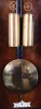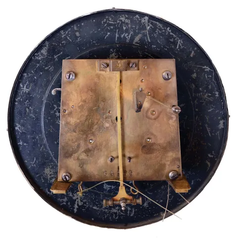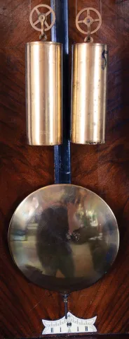 the case retains its original finish, nicely rubbed down. The upper left corner has a small dent and the crest has been repaired. The door has a split...