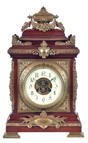 Germany, shelf clock, the mahogany case laden with a profusion of cast brass ornament, Arabic numeral white enamel dial, blued steel hands, 8 day, time and strike pendule a Paris movement, counting the hours on a gong