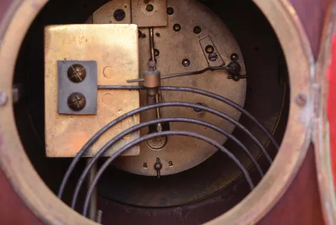 some ornament loose, one piece of trim missing from back, dial good, hands with oxidation, movement dirty, not ticking or striking,...