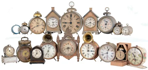 Clocks- 18 (Eighteen) Alarm, mostly American, all antique and vintage. Makers include Ansonia (one Bee in original box) , Seth Thomas, Waterbury, New Haven, Hamburg-American with top cones, and Early Bird automated. Early to mid 20th century.