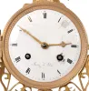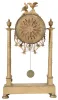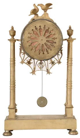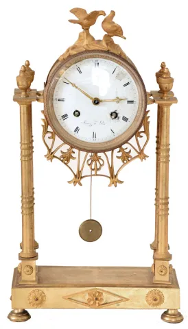 Feiver a Paris, France gilded brass architectural mantel clock, 8 days, time and bell strike, spring driven movement with silk thread suspension in a round case suspended above platform on four pad feet by four cast brass billars and surmounted by two doves. The white enamel dial is signed by maker. the case retains remanants of its original gilding and the back covering the movement is a replacement. The dial has some damage surrounding and above the right winding arbor. The movement appears to be recently serviced and is ticking and striking.