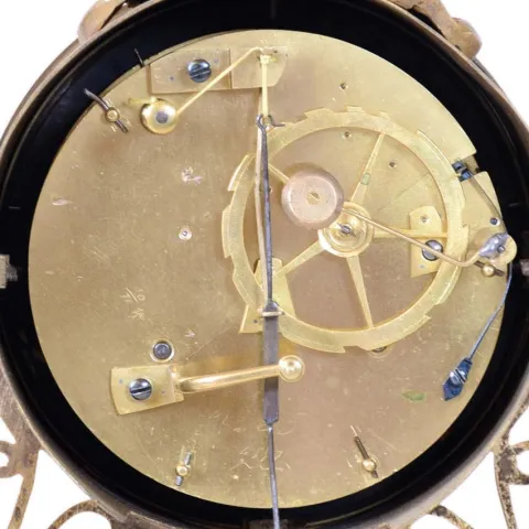 the case retains remanants of its original gilding and the back covering the movement is a replacement. The dial has some damage surrounding and above the right winding arbor. The movement appears to be recently serviced and is ticking and striking.