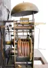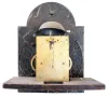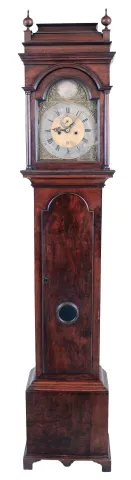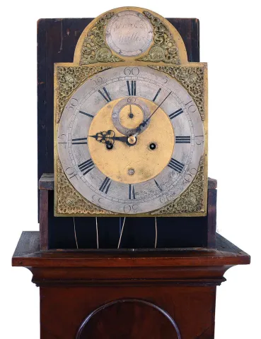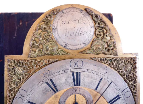 Aaron Miller, Elizabethtown, NJ, 8 days, time and bell strike, weight driven movement in a mahogany case with sarcophagus top, pendulum aperture on case door, resting on straight bracket feet. The brass dial has silvered chapter ring, cast brass spandrels, second's bit, calendar aperture and maker's boss. the case has been refinished with a rebuilt sarcophagus top. There is a repair to the upper left and side of the outer trunk door. The trunk door lock has been raised. The feet have been replaced. The minute hand has solder repair. The movement is typical of Aaron Miller, who was one of New Jersey's earlier clockmakers and father-in-law of clockmaker Isaac Brokaw (clock also in this sale): It has square dial mounting posts and wooden winding drums. Please see William Drost's "Clocks and Watches of New Jersey" page 169 for a very similar example.