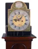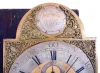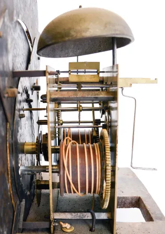 the case has been refinished with a rebuilt sarcophagus top. There is a repair to the upper left and side of the outer trunk door. The trunk door lock has been raised. The feet have been replaced. The minute hand has solder repair. The movement is typical of Aaron Miller, who was one of New Jersey's earlier clockmakers and father-in-law of clockmaker Isaac Brokaw (clock also in this sale): It has square dial mounting posts and wooden winding drums. Please see William Drost's "Clocks and Watches of New Jersey" page 169 for a very similar example.