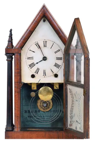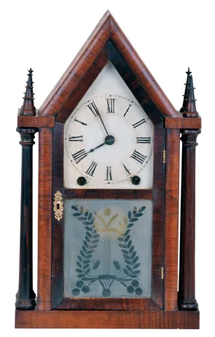 Brewster & Ingrahams, Bristol, Conn., 8 day 4-column "Sharp Gothic" or "steeple" clock with cut glass tablet.