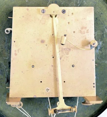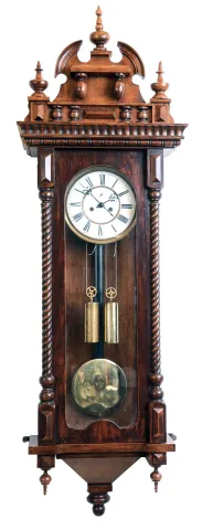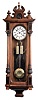 Clocks- 2 (Two) German hardwood 8 day 2 weight Vienna regulator wall clocks: "MS" Miller-Schlenker. Schwinninger #60433; "RMS" Mueller & Co. #27515; late 19th century one case has an old surface, the other has a newer glossy top coat, and one is missing a bottom wood finial and cap. Both white enamel dials are fine. The trademarked movements appear complete. Hts 45 in and 51.5 in